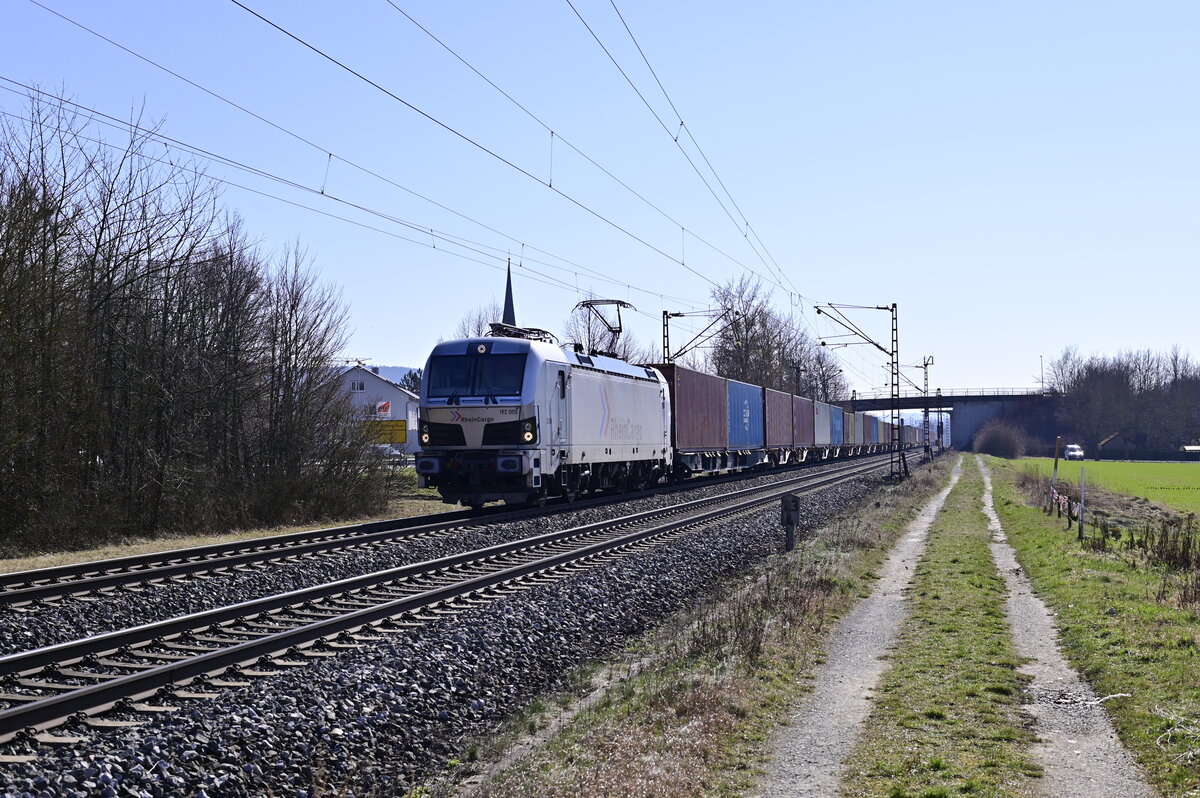 192 055 von RHC mit einem Containerzug gen Retzbach fahrend am Dienstag den 1.3.2022