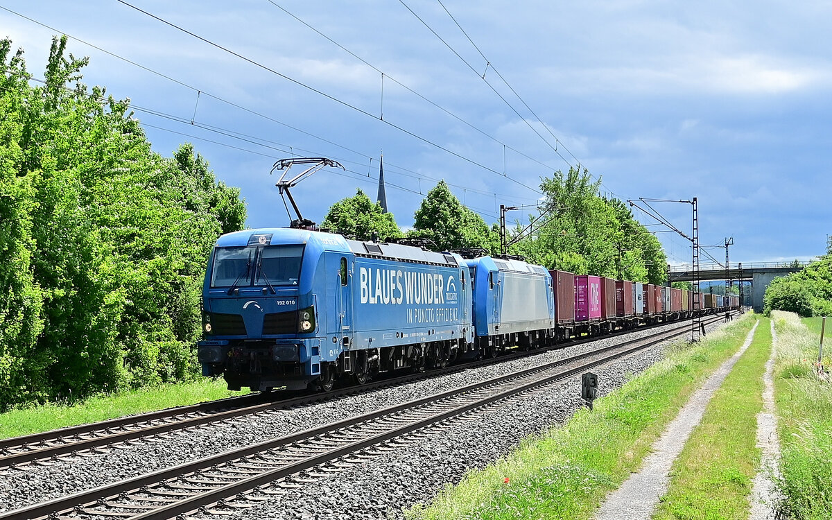 192 010 mit der kalten 185 523-8 D-ATLU und Kistelwagen am Haken bei Thüngersheim gen Karlstadt fahrend am 24.5.2022