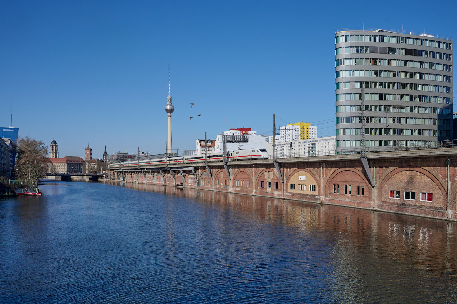 Auf dem Weg zum Berliner Ostbahnhof war ein unbekannter ICE 1 am 06.03.2026 auf der Berliner Stadtbahn unterwegs. Unweit der Jannowitzbrücke zeigte sich der Zug vor der Berliner Kulisse.