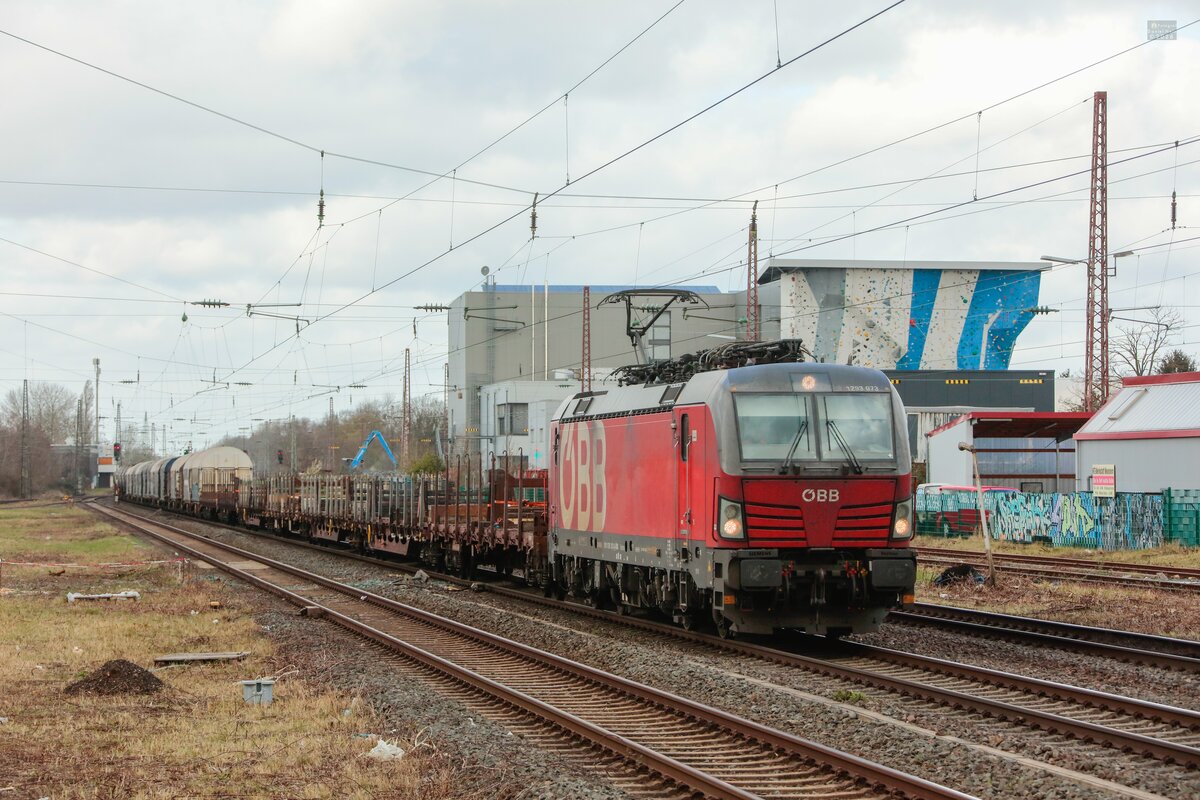 Der Blick mit den 2 Kirchtürmen im Altmühltal. Im Vordergrund Breitenfurt und oben am Berg der Kirchturm von Schernfeld Am 04.04.2023 legt sich 1293 038 mit ihrem kurzen Güterzug in die Kurve.
