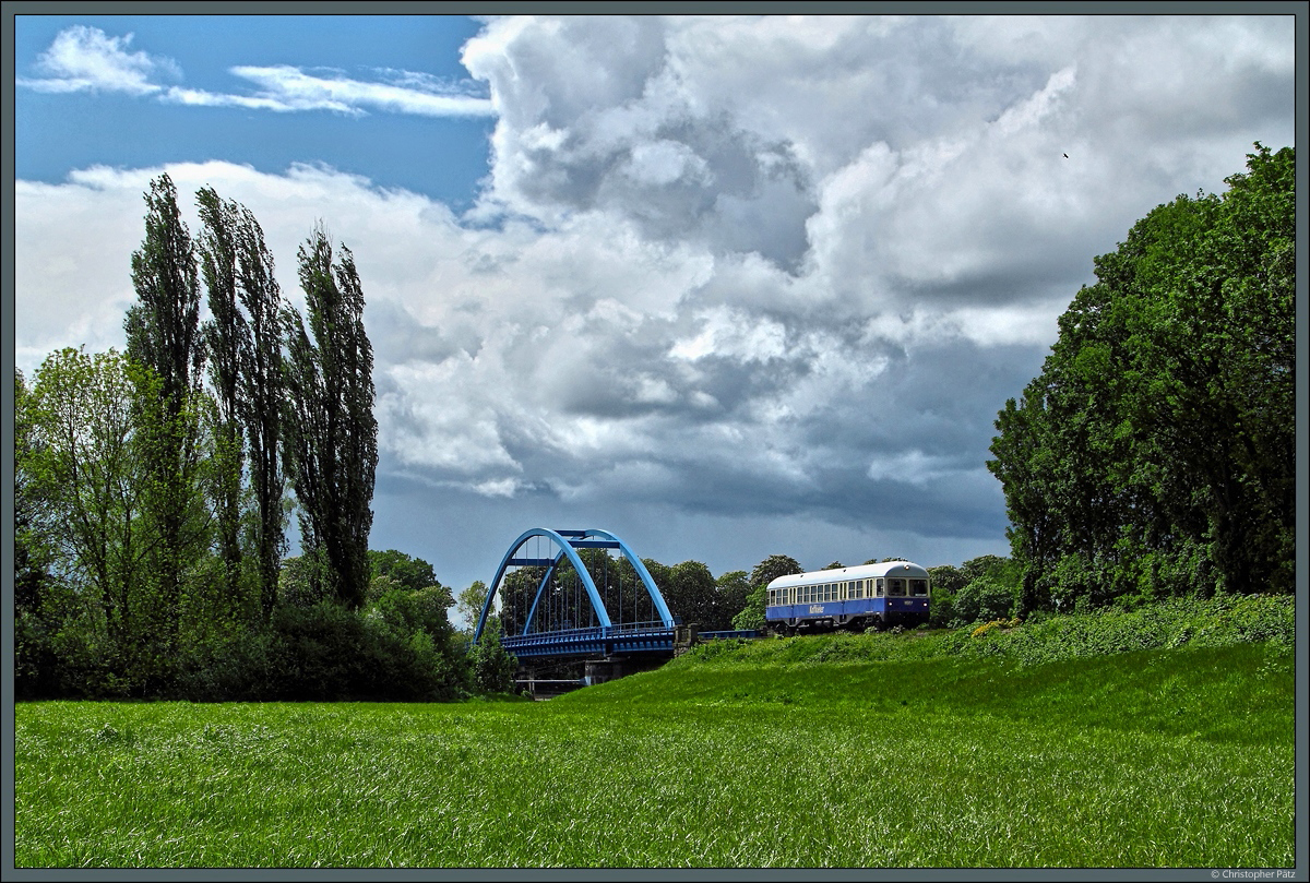 Bei Hoya überquert der Kaffkieker auf seiner Fahrt nach Eystrup die Weser. Der T3 der VGH hat als Pt 4503 gerade die 2008 erneuerte Brücke passiert. Am Himmel deuten dunkle Wolken bereits den nächsten Regenschauer an. (15.05.2016)