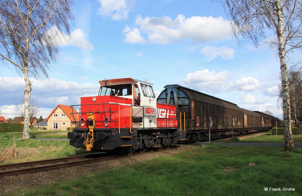 VGH 262 217-9 Verkehrsbetriebe Grafschaft Hoya Lok 22 (Bj. 1989, MaK) unterwegs mit einer Überführung von Eystrup nach Hoya, Hoyaer Eisenbahn Eystrup - Syke, fotografiert an einem BÜ in Hassel am 15.04.2015