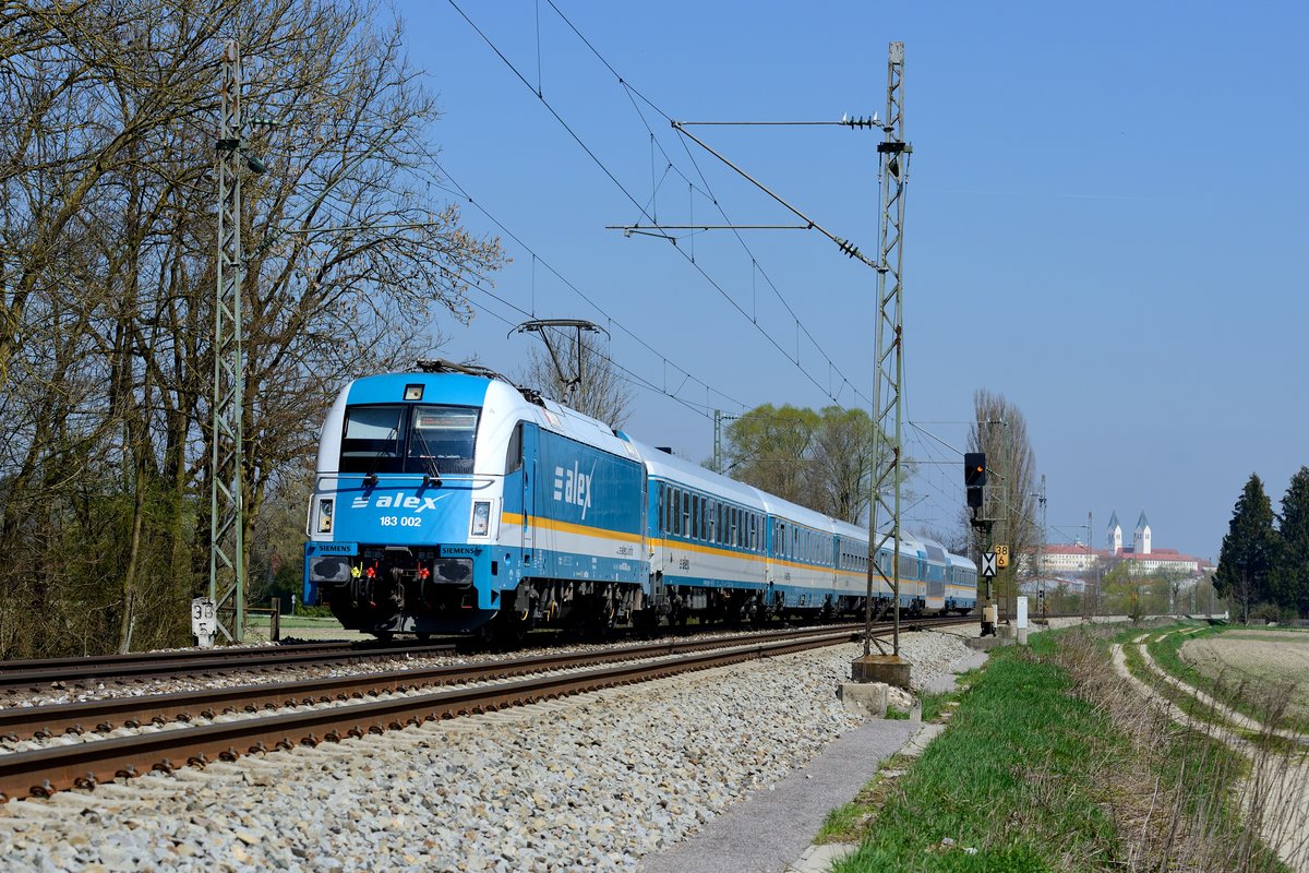 Charakteristisch für die KBS 930 sind die Alex Schnellzüge. Im attraktiven Farbschema gehalten und stets sehr sauber sind diese gern genommene Fotomotive. Am 11. April 2016 beförderte 183 002 den ALX 84111 zwischen Regensburg und München HBF. Bei Freising gelang diese Aufnahme, im Hintergrund grüßt der Dom St. Maria und St. Korbinian.