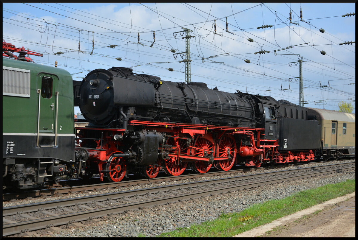 GmP a la BayernBahn: Anlässlich der Museumstage am 18. & 19. April 2026 im DGEG Eisenbahnmuseum Bochum in Bochum-Dahlhausen überführte das Bayerische Eisenbahnmuseum Nördlingen (BEM) die Schnellzugdampflok 01 180 als Gastlokomotive von Bayern nach Nordrhein-Westfalen. Eingereiht in den bekannten Henkelzug fuhr die Dampflok am 15.04.2026 gemeinsam mit der BayernBahn 139 314 und einem ehemaligen Postwagen als Begleiter sowie zwei Silberlingen von Nördlingen über Gunzenhausen, Würzburg und Darmstadt-Kranichstein nach Bochum-Dahlhausen. Der Zug konnte bei der Überführungsfahrt, sozusagen als Güterzug mit Personenbeförderung (GmP), in Würzburg beobachtet werden. Matthias Kümmel