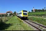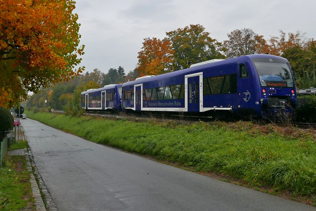 Auf Grund von Bauarbeiten zur Elektrifizierung der Südbahn sind VT 70 und VT 71 der Bodensee-Oberschwaben-Bahn nicht auf ihrer Stammstrecke zwischen Friedrichshafen und Aulendorf unterwegs, sondern von Friedrichshafen nach Überlingen-Therme. Kurz nach der Abfahrt wurden die BOB-Triebwagen 650 745 und 650 746 in Friedrichshafen fotografiert (23.10.2020).