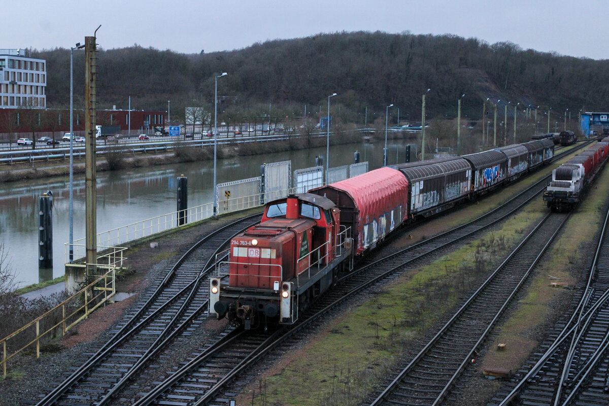 Es wurde schon düster, als 294 763 bei Saarstahl in Saarbrücken-Burbach rangierte (10.02.2026)