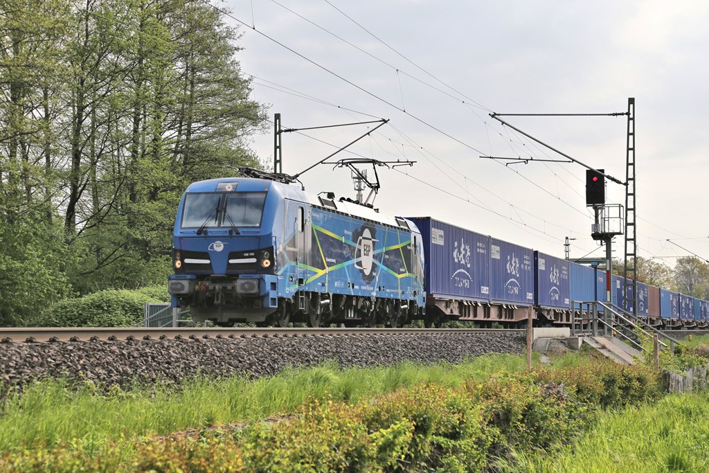 EGP 192102 erreicht hier am 4.5.2022 um 09.09 Uhr auf der Fahrt in Richtung Münster mit einem Container Zug den Ortsrand von Hasbergen.