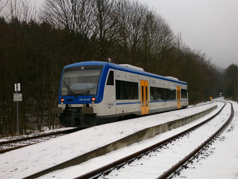 Die RegioShuttles der FEG werden nun auch nicht mehr mit VT bezeichnet, sondern mit der offiziellen Baureihenbezeichnung. "Hannah" wurde von VT 3.02 in 650 056 umbenannt und ist hier unterwergs als FEG 30423 von Holzhau nach Freiberg zwischen Berthelsdorf Ort und Berthelsdorf