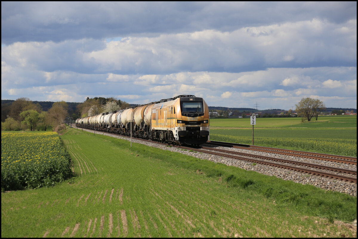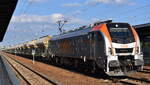 Havelländische Eisenbahn AG, Berlin-Spandau [D] mit ihrer "159 008" [NVR-Nummer: 90 80 2159 008-2 D-HVLE] und einem Schüttgutwagenzug am 26.09.23 Höhe Bahnhof Flughafen BER Terminal 5.