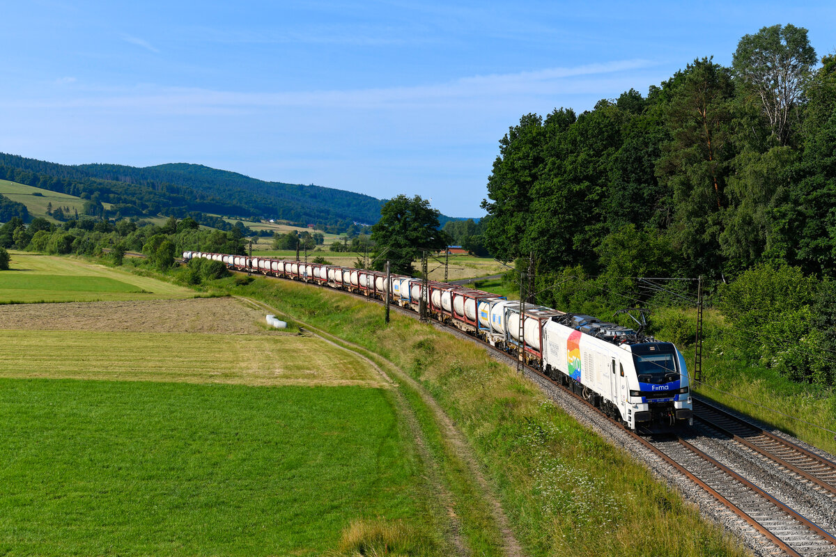 Mit dem vollen Laugenzug DGS 88676 von Neuhof nach Sehnde war am Morgen des 21. Juni 2025 die 159 237 von HHPI im osthessischen Haunetal unterwegs. Bei Odensachsen gelang mir eine Aufnahme der imposanten Euro Dual Maschine aus dem Hause Stadler. Die äußere Gestaltung soll auf die LGBTIQ-Freundlichkeit des Unternehmens HHPI hinweisen. Christoph Schneider