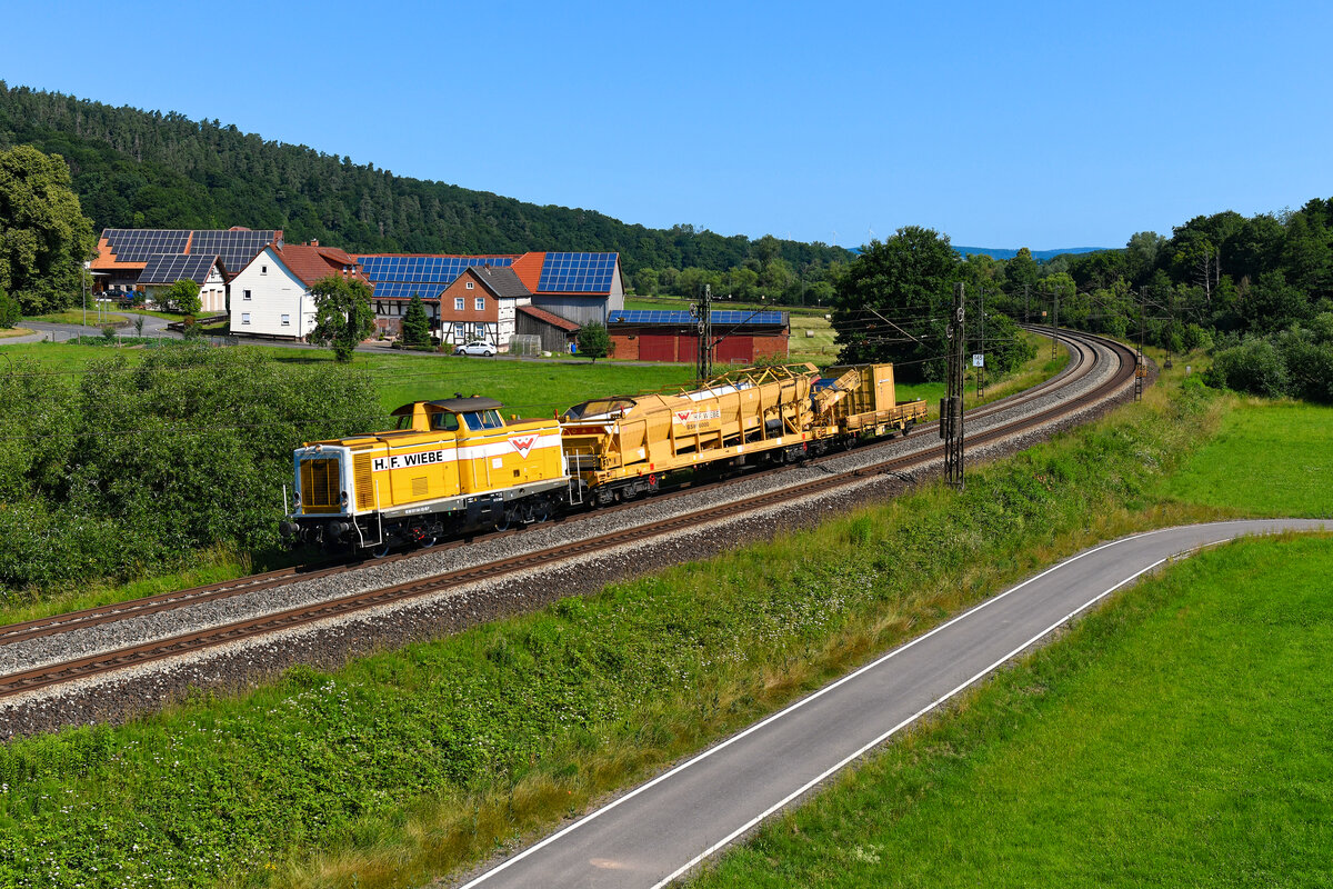 Hier nochmal etwas näher: 264 011-8 der Wiebe mit Beton-Schwellenzug in Fahrtrichtung Süden. Aufgenommen am 25.08.2012 zwischen Bad Sooden-Allendorf und Oberrieden.