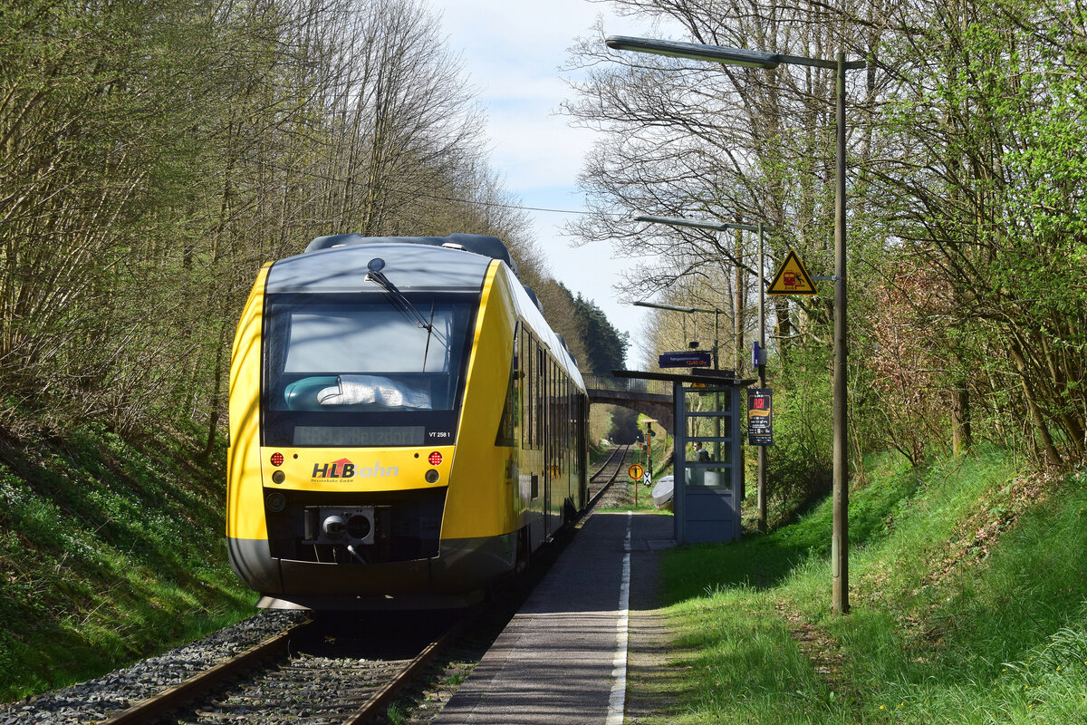 VT 203 der Hessischen Landesbahn war am 22.04.2026 als RB 24439 auf dem Weg von Limburg nach Wiesbaden. In Kürze wird der Haltepunkt Lindenholzhausen durchfahren.
