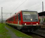 626 982-2 steht am 19. Dezember 2011 mit Zugziel "Güterzug" und dem VT 626 043 der Mandaubahn sowie dem VT 798 731-6 der EFR auf Gleis 5 in Kronach. Die Fuhre war auf dem Weg nach Zittau.