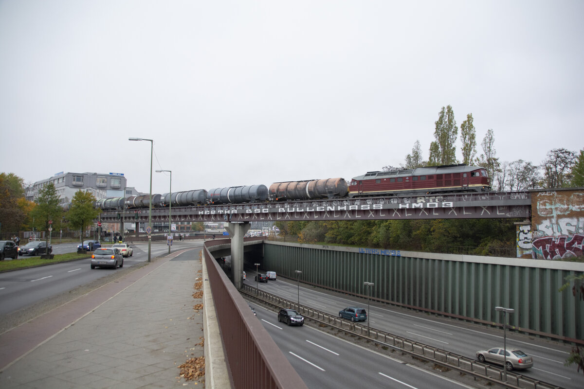 232 004 kam mit einem leeren Kesselzug aus Marienfelde. Dort befand sich ein Tanklager in Lankwitz. An dieser stelle, in Berlin, überfährt der Zug die A100. Ziel war Stendell. 06.11.2020 Jens K