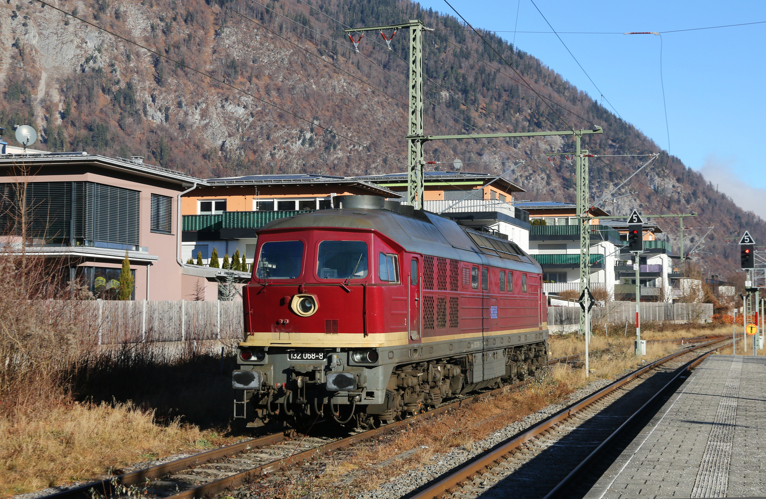 Mit dem Dolomitzug aus Brandenburg rollte 232 529 vom Bahnbetrieb Gera am 03.12.25 durch Holzweißig Richtung Halle(S). Daneben ist grad der DHL-Containerzug Richtung Bitterfeld unterwegs.