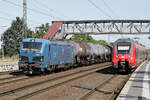 Leipziger Eisenbahnverkehrsgesellschaft mbH, Leipzig [D] mit der Eurodual Lok "2159 228-6" [NVR-Nummer: 90 80 2159 228-6 D-RCM] und einem Kesselwagenzug am 08.09.23 Höhe Bahnhof Luckenwalde.