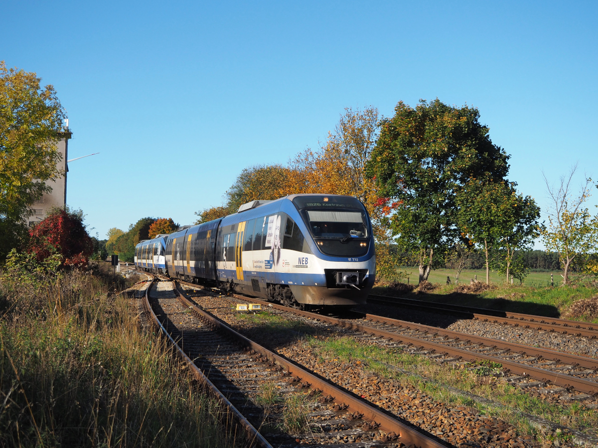 Ein Talent-Doppel, gebildet aus VT 732 und VT 734 der Niederbarnimer Eisenbahn (NEB), Richtung Kostrzyn, hier beim Erreichen des Bahnhofs Seelow-Gusow. Seelow, der 18.10.2025