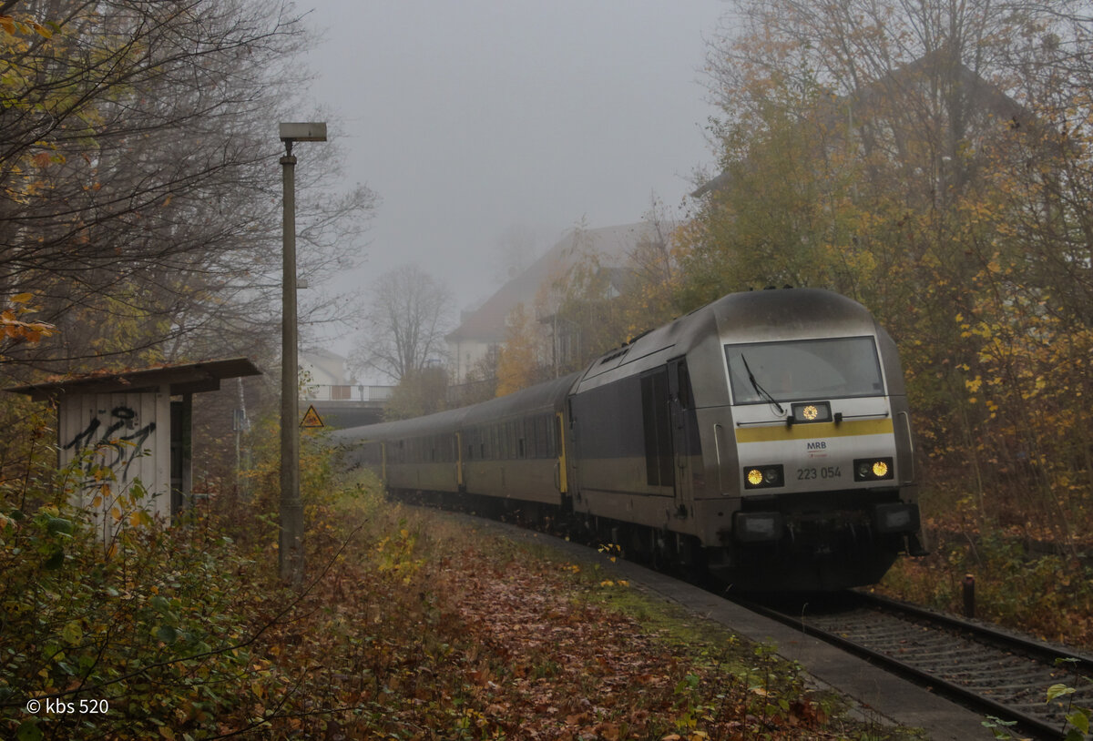 Der Regionalexpress 6 war ein Jahrzehnt lang mit Wagen der deutschen Reichsbahn bespannt. Zum bedauern sehr vieler Eisenbahnfans wurde dieser legendäre Wagenpark Ende 2024 bei TDRO außer Dienst genommen. Am 09.11.2024 fährt 223 054 auf Abschlussfahrt Roßwein entgegen und passiert gerade Döbeln-Zentrum im Morgennebel, um später das Ziel Nossen zu erreichen.