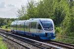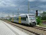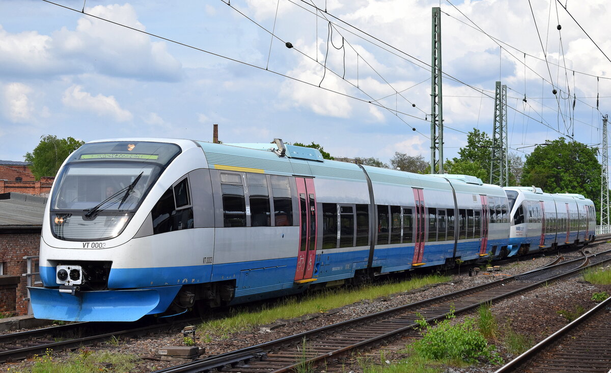 Transdev GmbH - Mitteldeutsche Regiobahn mit zwei Talent-Triebzügen "VT 0003" + "VT 0004" auf Dienstfahrt am 11.05.23 Vorbeifahrt Bahnhof Magdeburg-Neustadt.