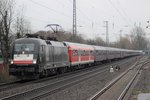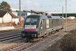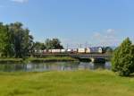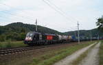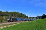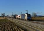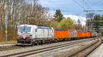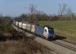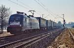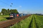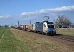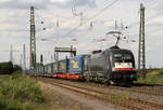 MRCE 182 566 mit Lkw Walter KLV in Hilden, April 2018.