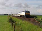 Windräder gehören an der Marschbahn zum üblichen Beiwerk. Auch die NOB ist mit ihren Wendezügen ständig als Nutzer der Strecke präsent. Hier wird ein solcher Wendezug am 29.5.2020 um 9.28 Uhr nahe dem BÜ Gotteskoog in Richtung Niebüll geschoben. Meiner Beobachtung nach werden die Züge aus Westerland grundsätzlich geschoben und in Gegenrichtung mit Lok voran gefahren!