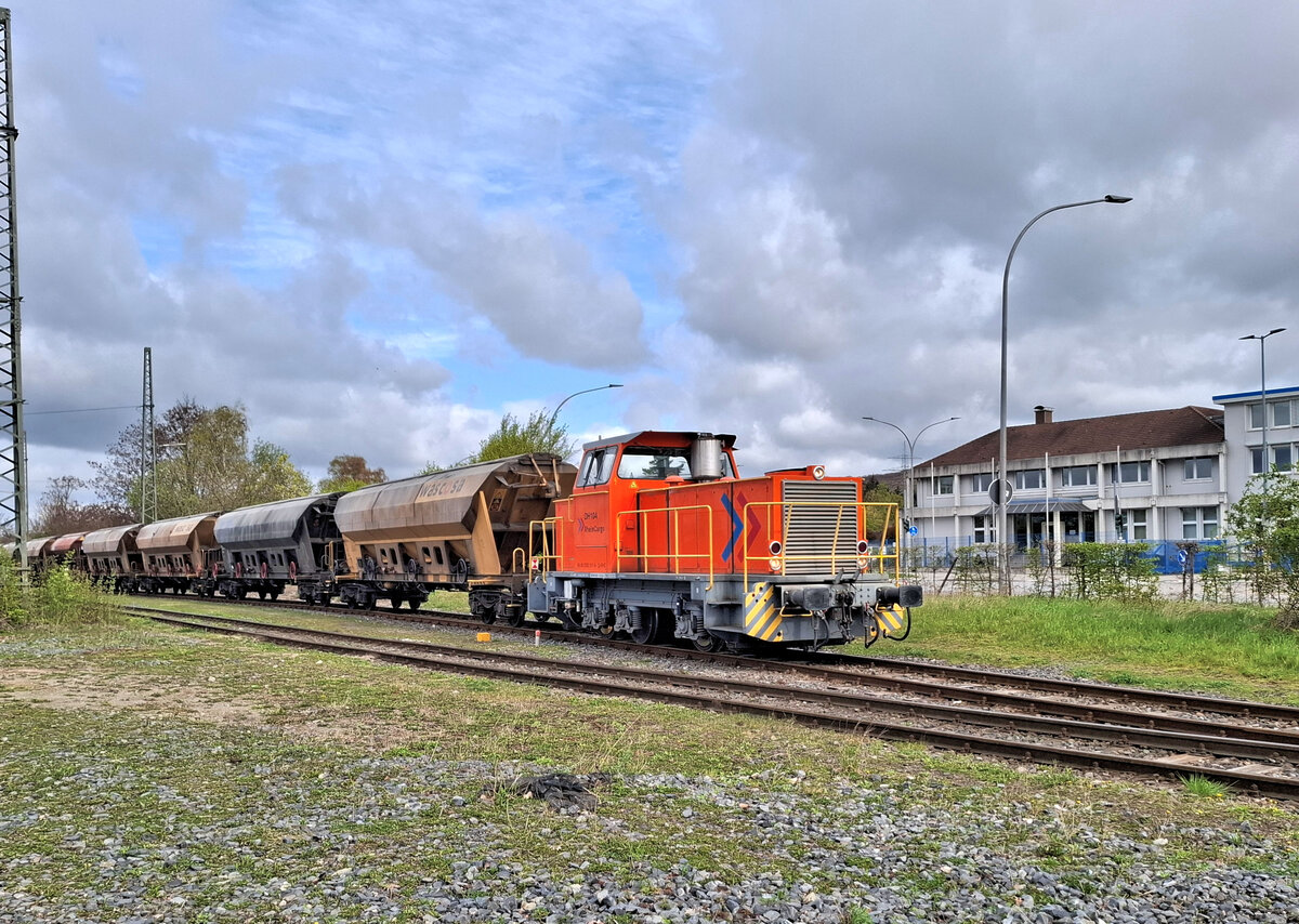 DH 104 von Rhein Cargo mit der Registriernummer 0262011-6 ist derzeit bei den Zement Werken in Lengerich in Westfalen im Einsatz. Am 10.4.2026 um 11.00 Uhr zog sie acht Schüttgutwagen aus dem Bahnhof Lengerich auf das Werksgelände.