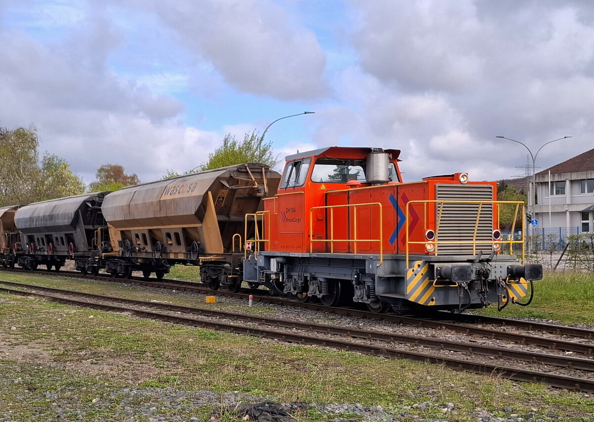DH 104 von Rhein Cargo mit der Registriernummer 0262011-6 ist derzeit bei den Zement Werken in Lengerich in Westfalen im Einsatz. Am 10.4.2026 um 11.00 Uhr zog sie acht Schüttgutwagen aus dem Bahnhof Lengerich auf das Werksgelände. Rechts ist im Hintergrund das Verwaltungs- gebäude von Buzzi zu sehen.