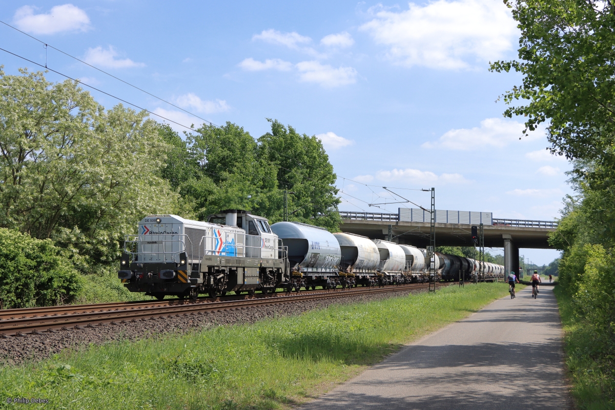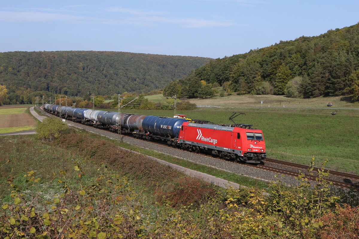 185 588 von "Rhein Cargo" mit einem Kesselwagenzug am 12. Oktober 0222 bei Harrbach am Main.