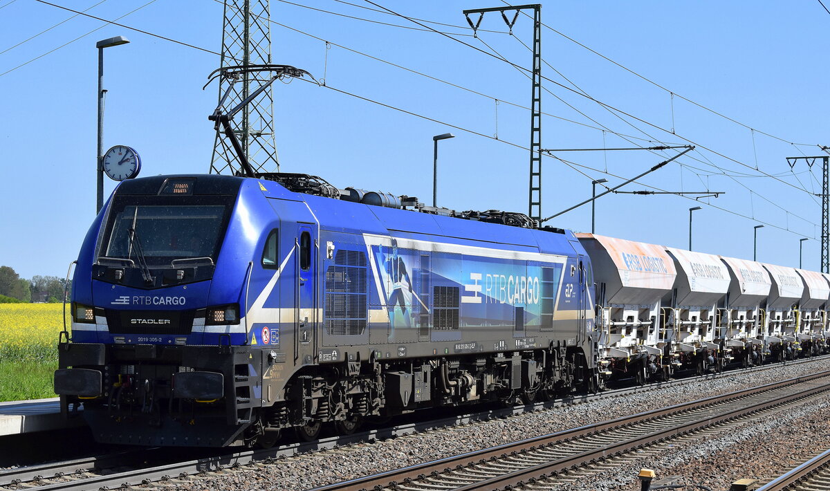 RTB CARGO GmbH, Düren [D] mit der EURO 9000 Lok "2019 305-2", Name: "Krefti" [NVR-Nummer: 90 80 2019 305-2 D-ELP] und einem Ganzzug firmeneigener Schüttgutwagen am 30.04.24 Höhe Bahnhof Rodleben.