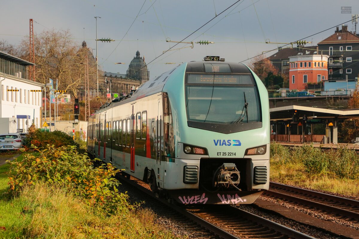 VIAS ET25 2301 als Zug 20021 von Arnhem Centraal nach Düsseldorf Hbf. Abfahrt vom Bahnsteig in Zevenaar (NL), 26.12.2022, 11.55u. Bild 22884.