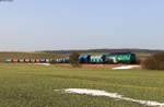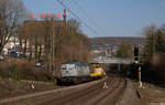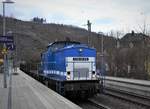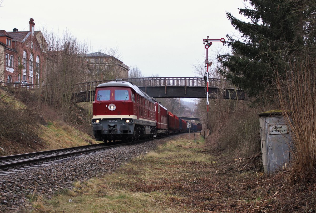 232 356-6 und 155 110-0 (WFL) fuhren am 21.03.21 mit einem leeren Holzzug durch Pößneck nach Triptis.