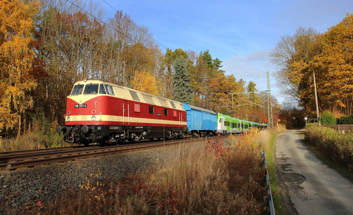 Am 04.11.2025 fuhr die Press 118 757 mit einer Überführung nach Cheb. Am Haken zu den Kupplungwagen ein neuer grün weißer Flirt 428 Baureihe, wahrscheinlich zur Eisenbahntestrecke in Velmin. Eingefangen wurde der Zug bei der EInfahrt in Plauen am alten Bk Hasselbrunn.