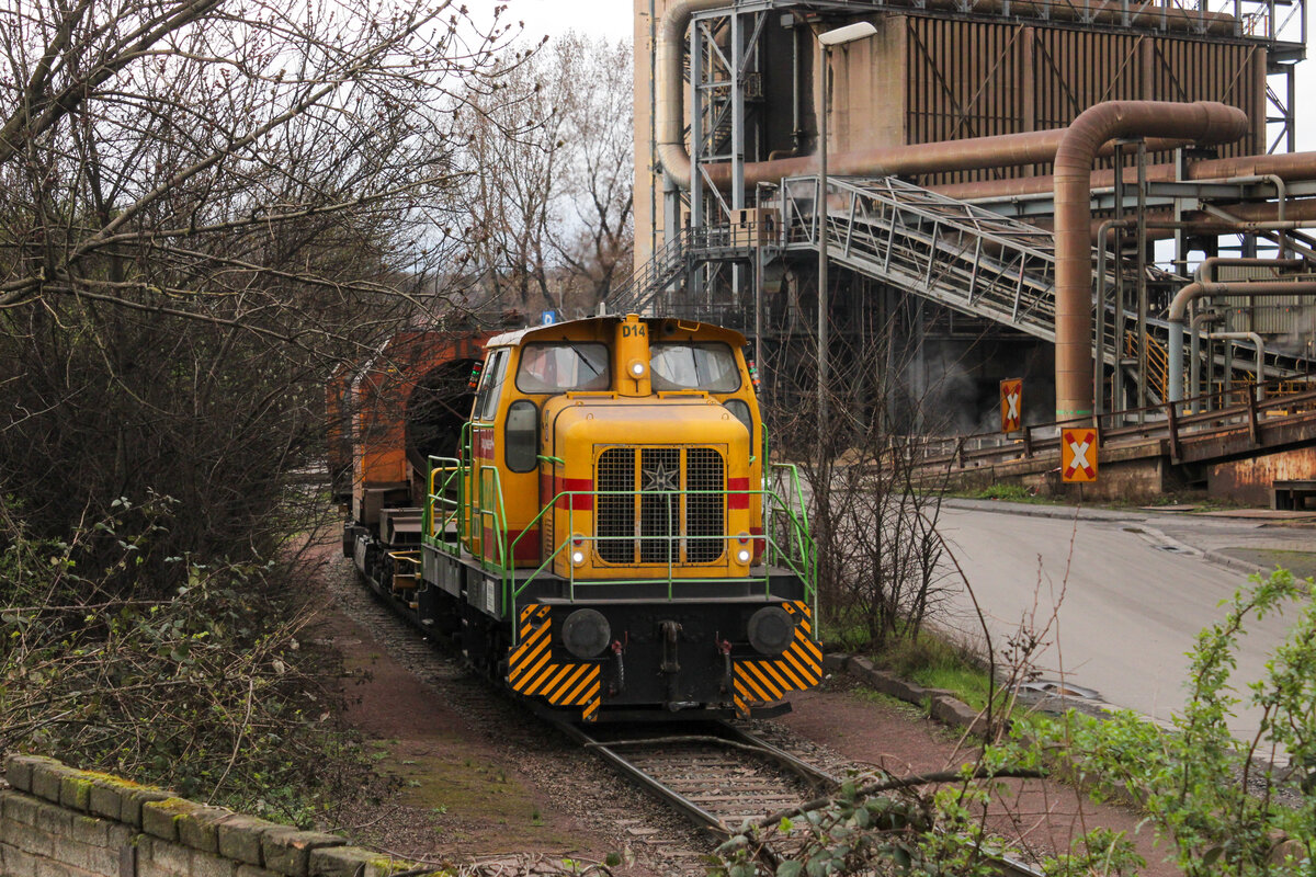 Durch einen großen Freischnitt an der Dillinger Hütte sind einige neue Fotomöglichkeiten entstanden. Am 01.03.2026 rangierte D11 (Henschel 31238/1967) einige Torpedopfannenwagen in der Nähe des Hochofen 4. Leonhard Groß