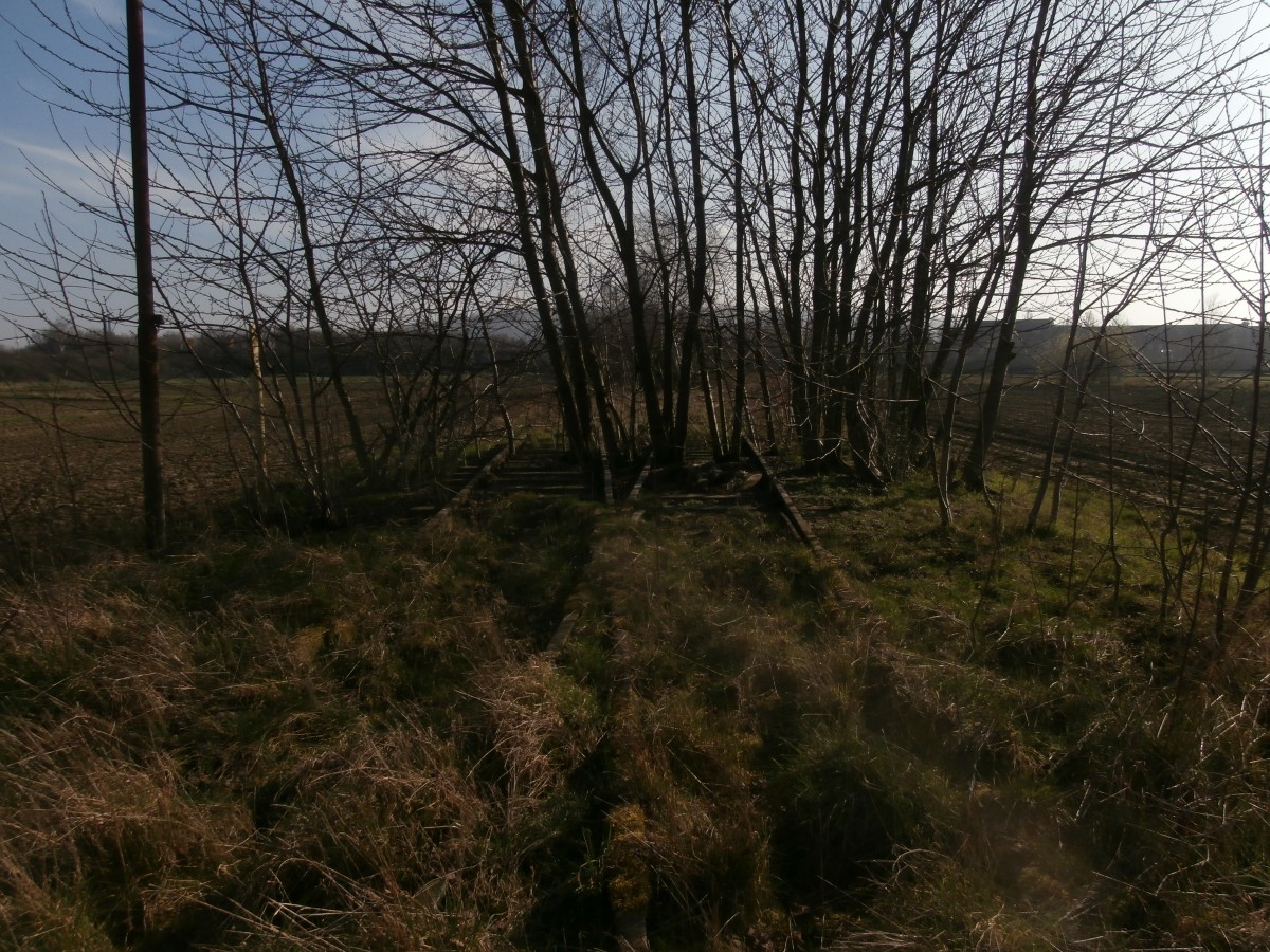 Der Blick in Richtung Pfeifer & Langen, hinter dem Autohaus biegt das Gleis nach links ab und führt entlang des Autohauses. Grevenbroich Feldwege Gewerbegebiet Ost 08.03.2014
