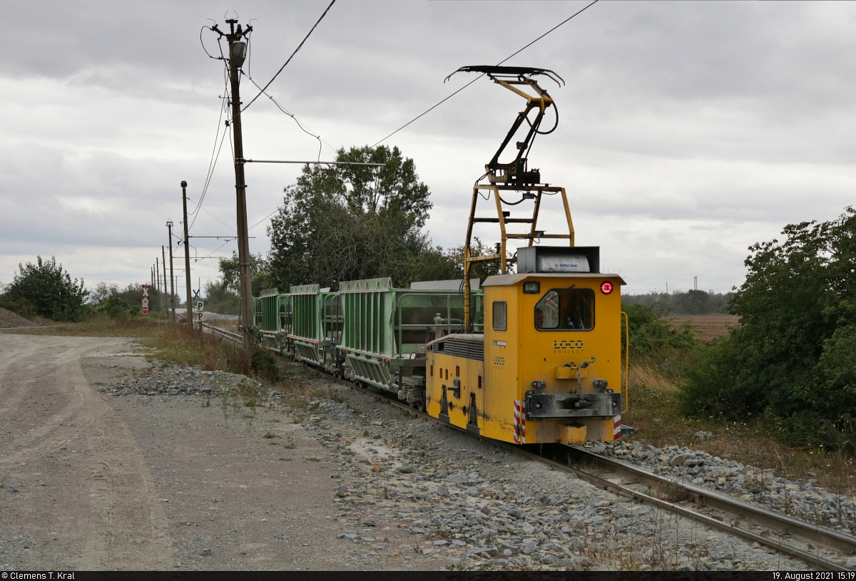 Leerzug mit Lok 5 überquert auf seiner Fahrt in den Feierabend die Bahnstrecke Schönebeck–Güsten (KBS 335). Brücke und Oberleitungsmasten haben schon bessere Tage gesehen.