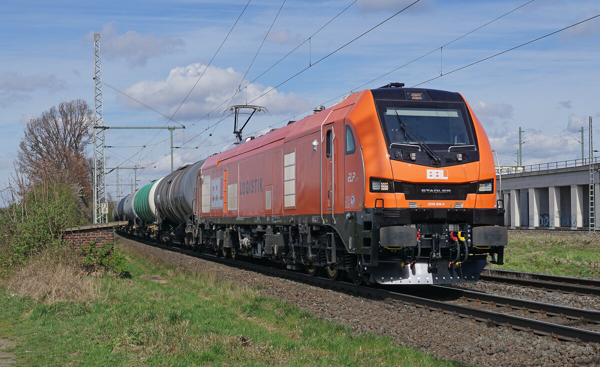 Die Euro9000 Lokomotive 2019 309-4 von BBL LOGISTIK bügelt mit einem Kesselzugam 25.03.2024 durch Porz am Rhein.
