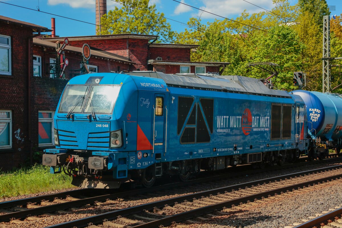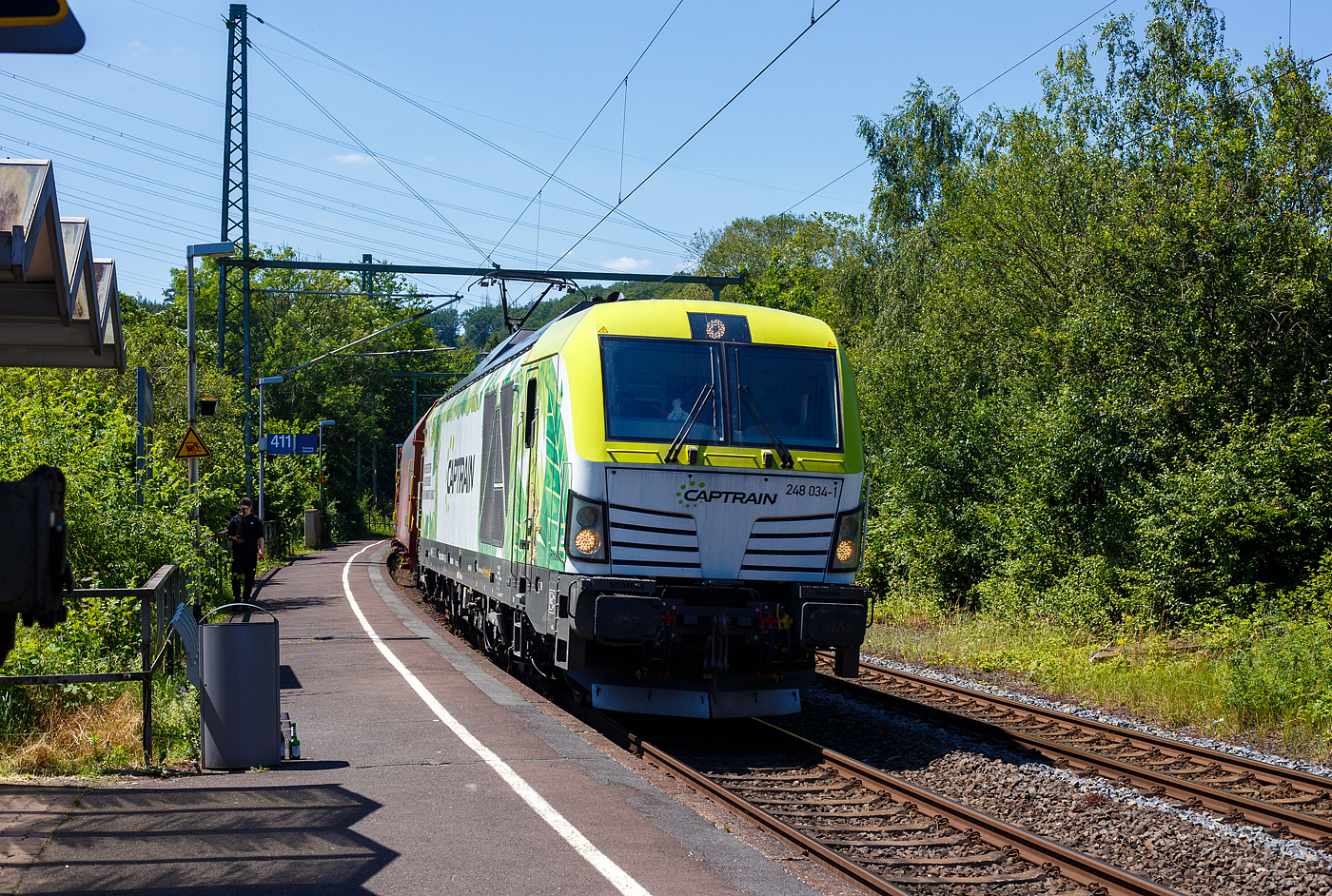 Die an die Dortmunder Eisenbahn GmbH (DE) vermietete SIEMENS Vectron Dual Mode 248 034-1 "Phoenix" (90 80 2248 034-1 D-DE) der Captrain Deutschland GmbH fährt am 25 Juni 2024, mit einem Coilzug (Wagen der Gattung Shimmnis-ttu der Ermewa) durch den Bahnhof Scheuerfeld/Sieg in Richtung Siegen.