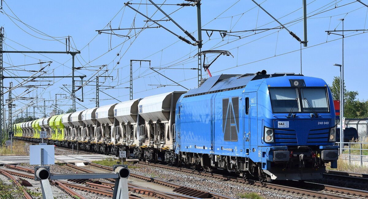 SKL Schienen Komplex Logistik Magdeburg GmbH & Co. KG, Magdeburg [D] mit der Vectron Dual Lok "248 049" [NVR-Nummer: 90 80 2248 049-9 D-NRAIL] mit einem Ganzzug Drehgestellwagen für Oberbaustoffe (DB Bahnbau Gruppe) mit Betonbahnschwellen am 14.10.24 Höhe Bahnhof Schönefeld b. Berlin.