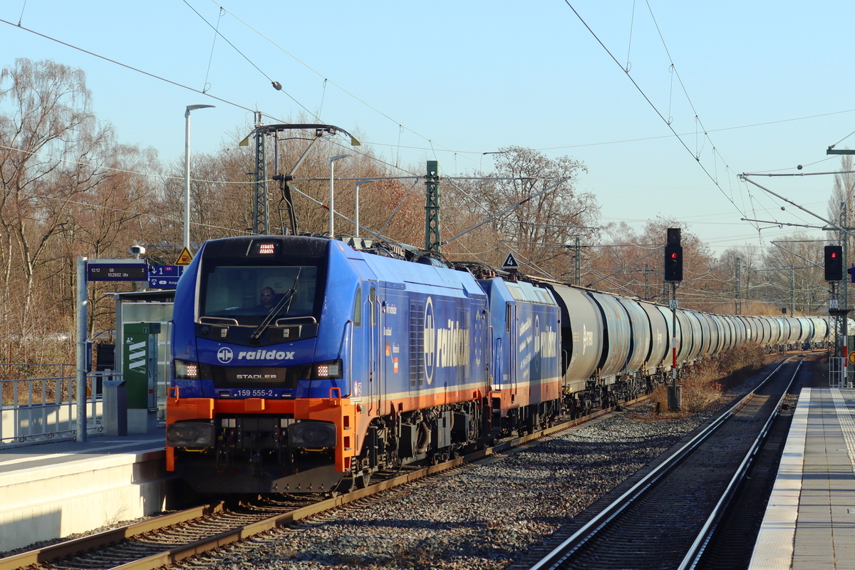 Kraftpaket des Chemie-Transports: 2159 232-8 (Lok 566 | Stadler Eurodual) bewegt Kesselwagen über die Saale bei Halle-Wörmlitz Richtung Halle Rosengarten. 🧰 InfraLeuna GmbH 🕓 7.3.2025 | 15:33 Uhr