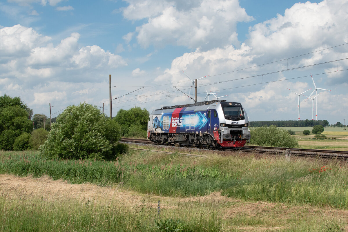 Das Bild sollte dem aktuellen und umstrittenen Themen Deutschlands oder der Welt widerspiegeln. 159 210 als die neue Zukunft der Schiene und im Hintergrund die erneuerbaren Energieerzeuger. Lz kommend aus dem PCK Schwedt in Richtung Angermünde 12.6.2022