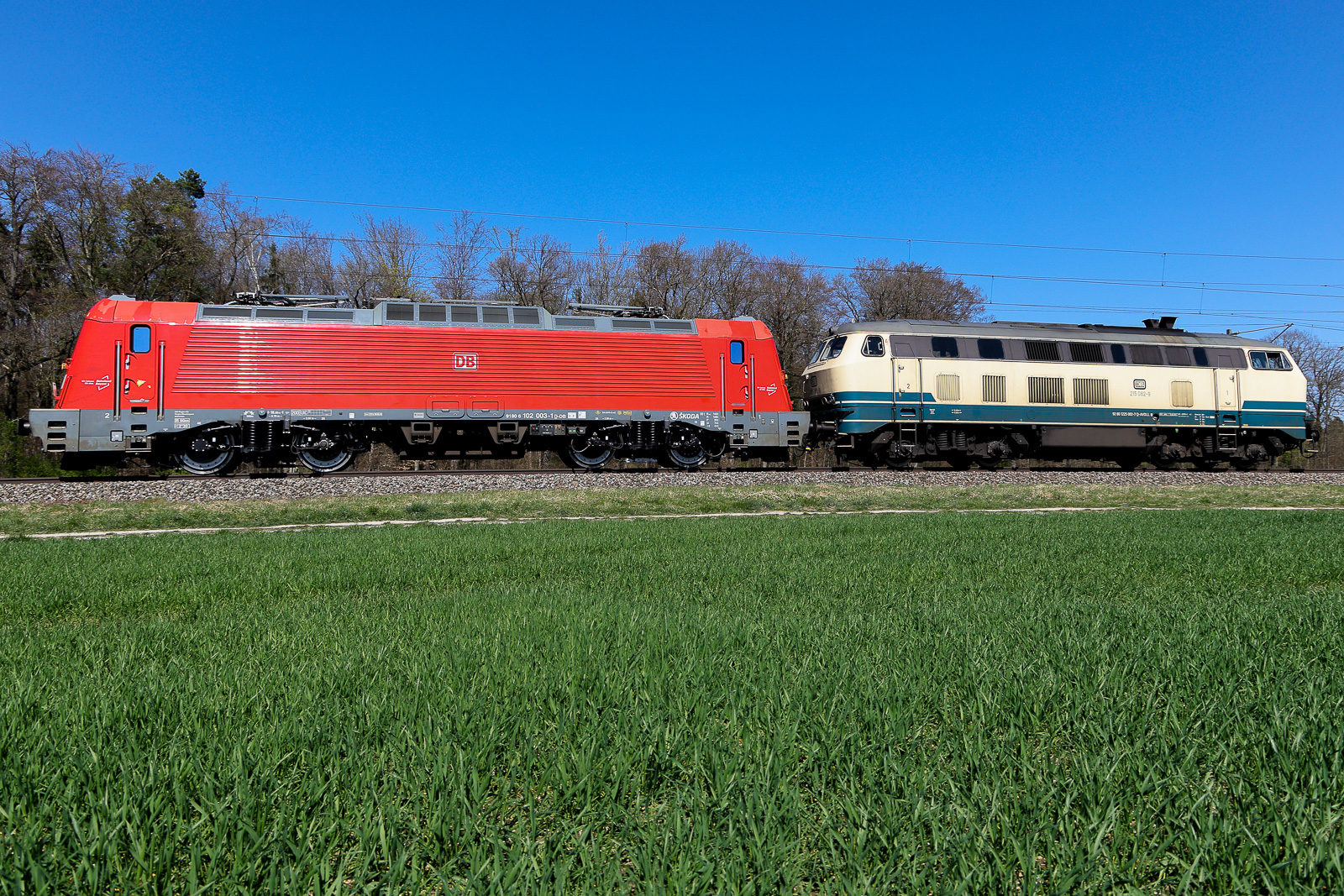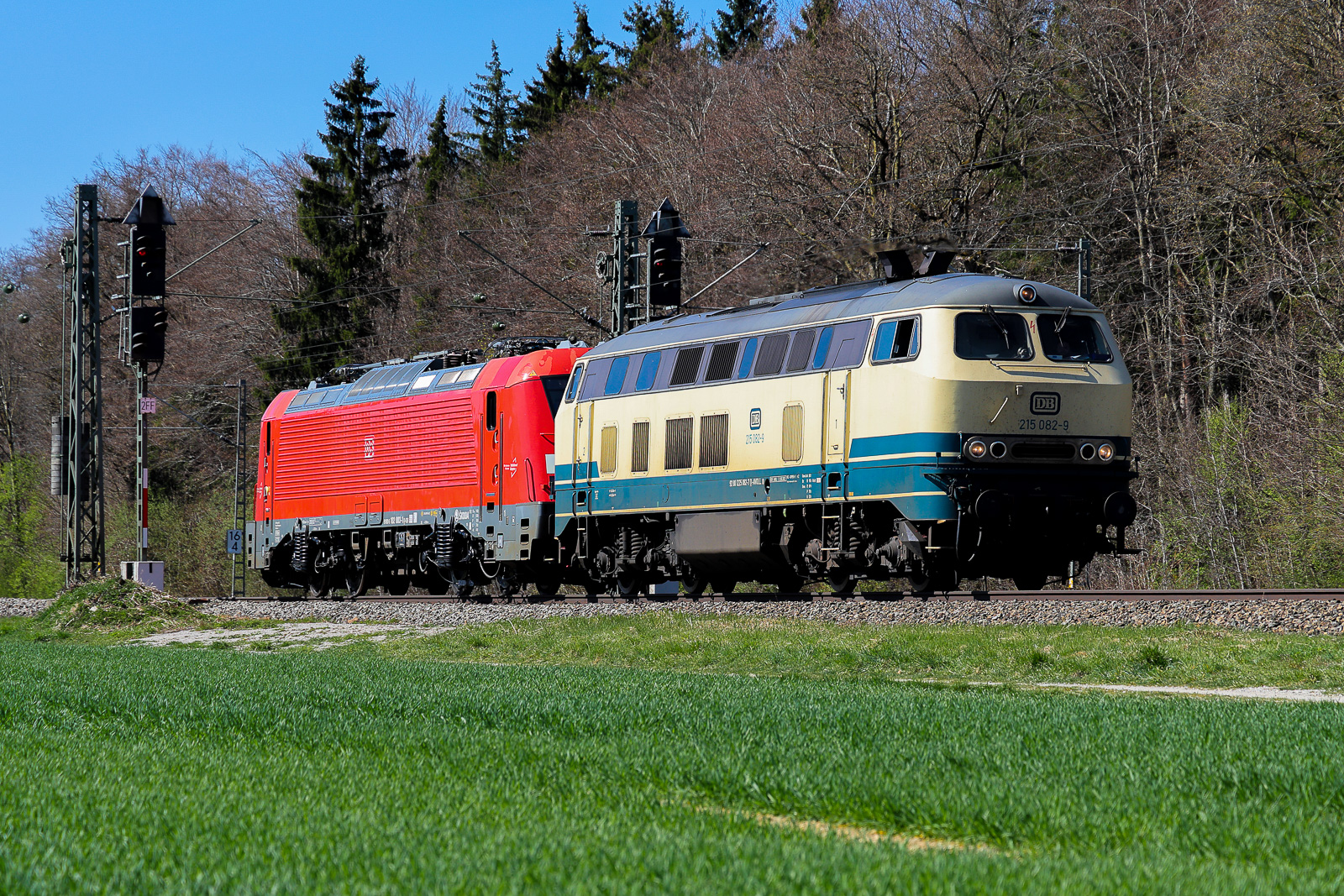 Aggerbahn 215 082-9 [9280 1225 082-7 D-AVOLL] mit der Skoda Lok 102 003 am 7.4.2026 bei Eglharting. Die 215 ist zur Zeit bei smart rail im Einsatz, deswegen sieht man sie grad häufiger in der Münchner Gegend. Flo Weiss