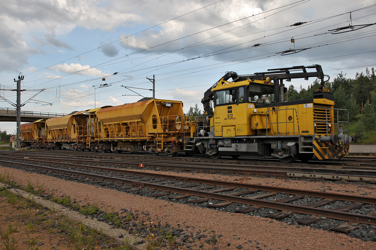 Zwei Schotterwagen und Gleisinstandhaltungsfahrzeug Tka8 #580 der VR-Track im Bahnhof Riihimäki, 12.4.13
