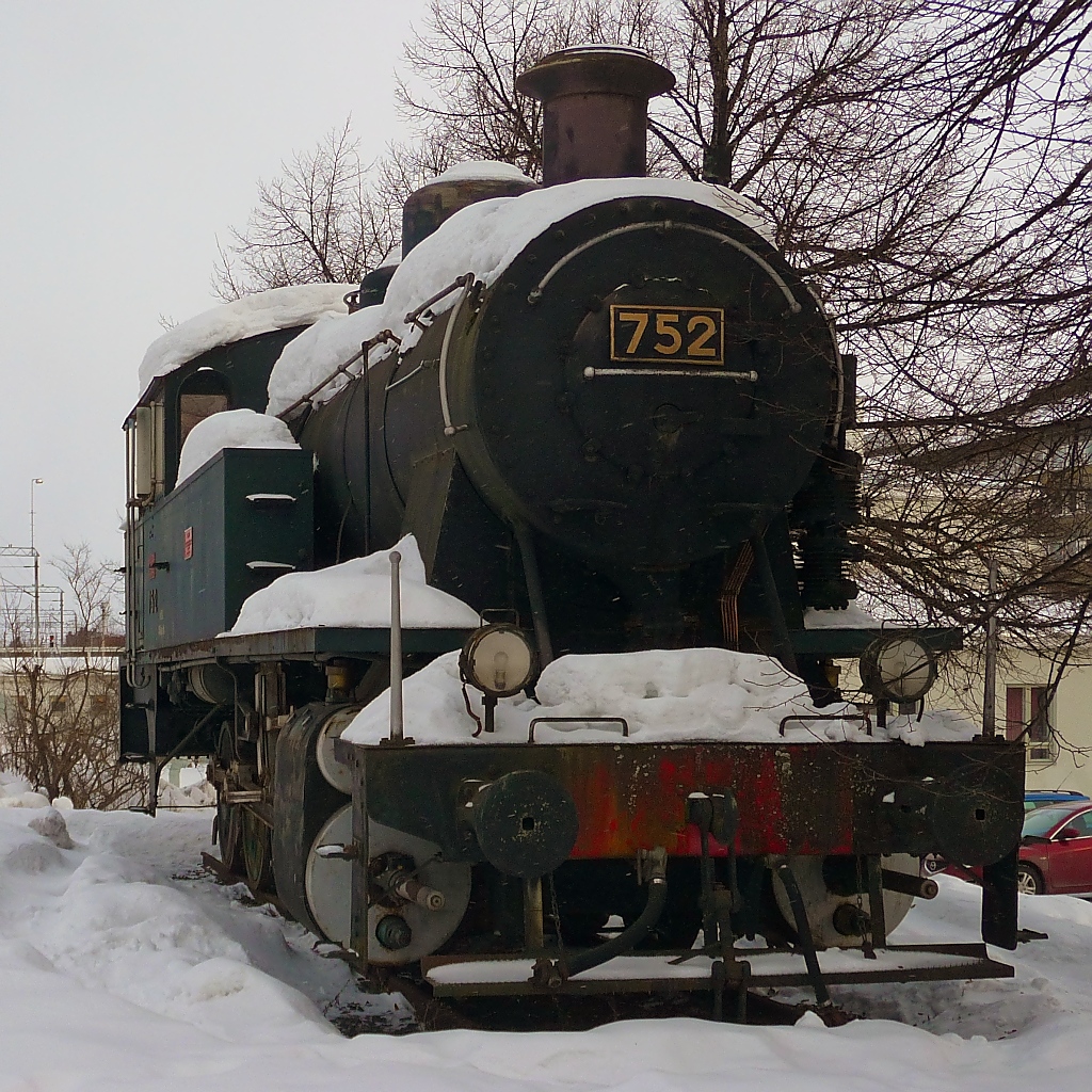 Verschneite Dampflok 752 der VR-Baureihe Vr3, Achsfolge 0-E-0, aufgestellt am Bahnhof Kuopio, Finnland, 08.3.13
