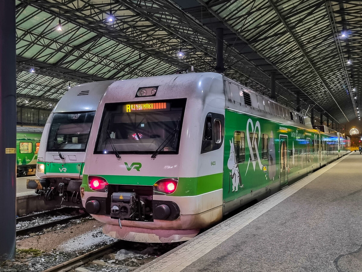 Am 24.07.2017 stehen IC3 nach Joensuu (rechts) und RB9828 nach Helsinki (links) im Bahnhof Lahti.