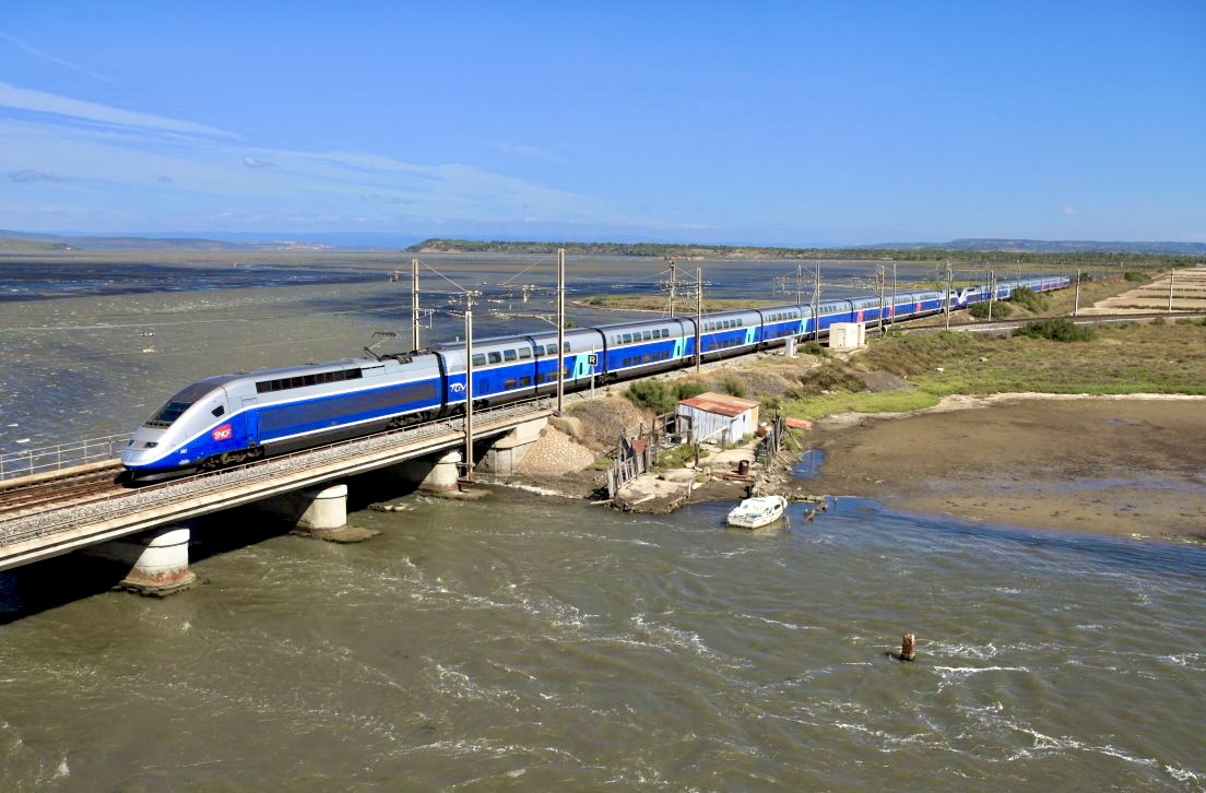 Der SNCF OUIGO 7856 verlässt den Bahnhof von Antibes. Der Zug besteht aus zwei TGV Rame, hier ist nur der hintere, der TGV DASYE mit der Nummer 777 zu sehen.