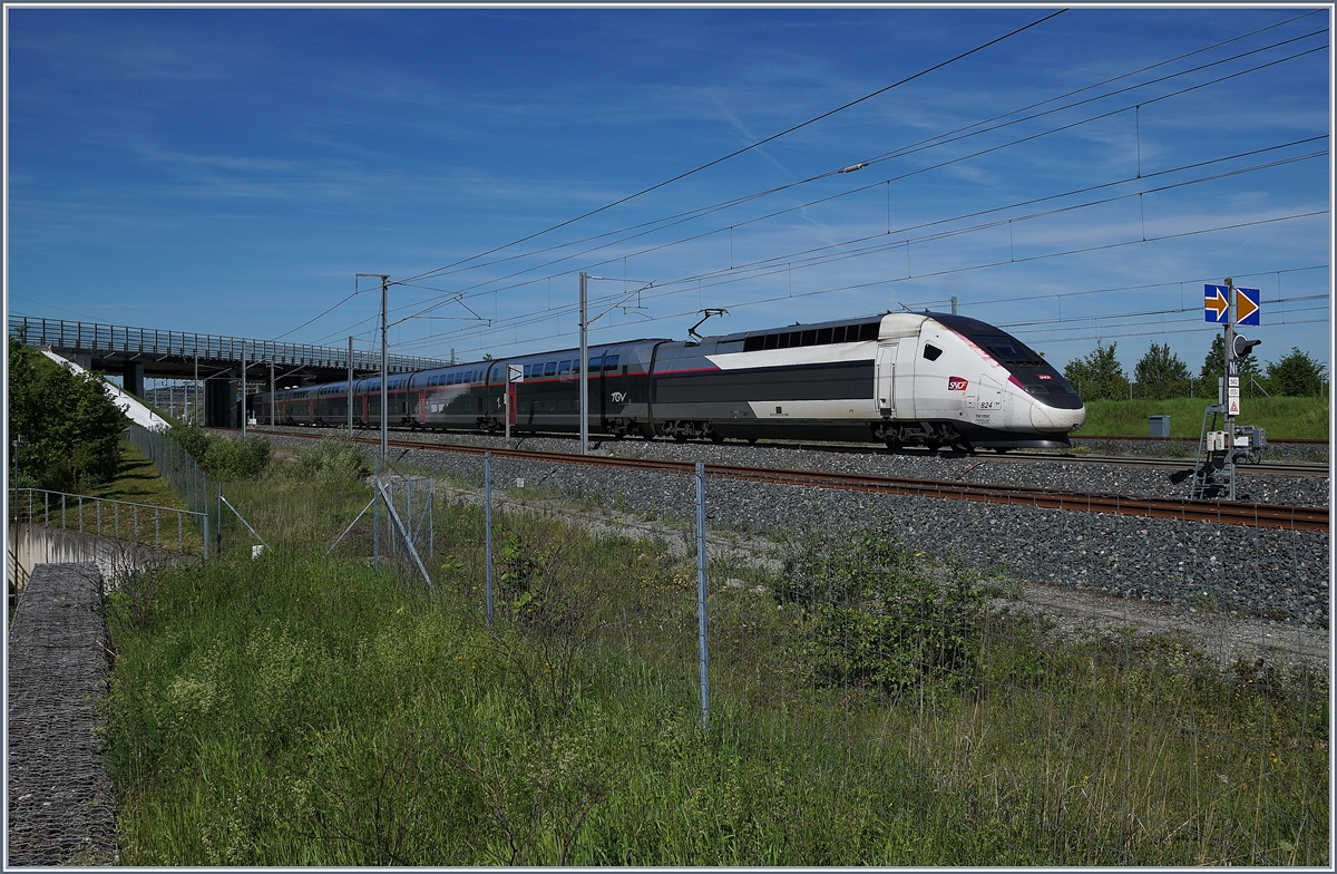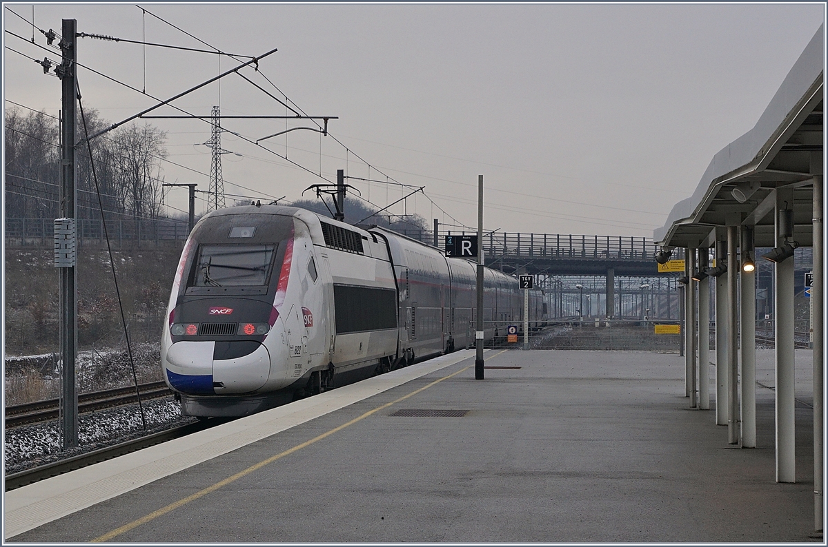 Der SNCF TGV 4734 auf dem Weg nach Mulhouse erreicht den Bahnhof Belfort-Montbéliard TGV.