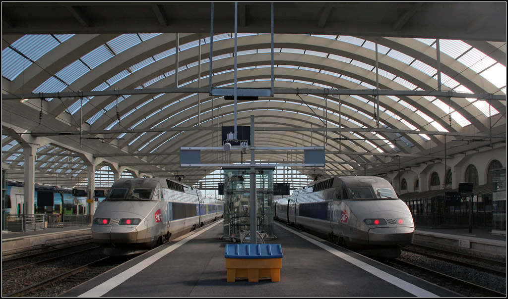 Zweimal TGV unter Stahlbetonbögen - Impression vom Gare Centrale in Reims.