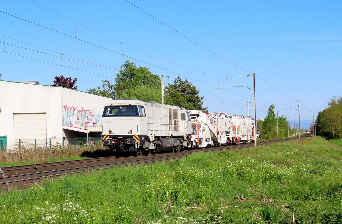 Mommenheim - 28. April 2025 : Von Alpha Train an Time Express TFEF G2000 BB 5001735 mit eine ETF Baumaschine am Zug 402720 von Mulhouse Nord nach Metz Sablon. Gilles LENHARD