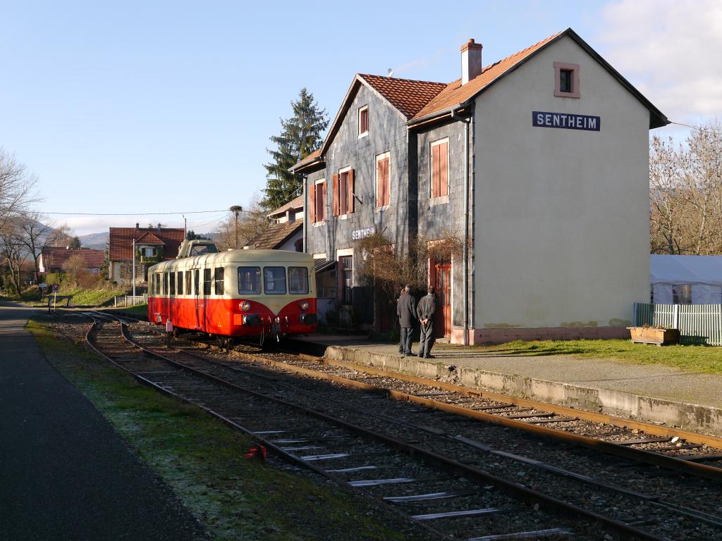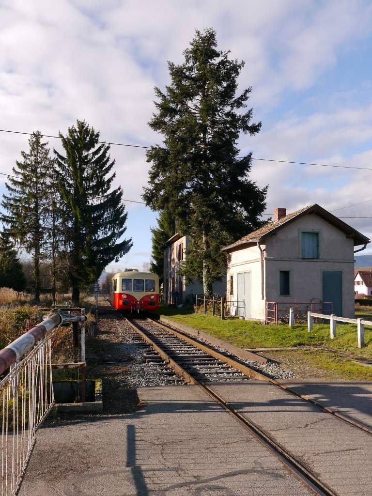 Der ehemalige SNCF Triebwagens X5852 vom Typ U-150 'Mobylette' unterwegs bei Guewenheim auf der Dollertalbahn im Oberelsass. Hier gut zu sehen die eigentümliche Konstruktion des Fahrwerks dieser in der direkten Nachkriegszeit konstruierten Triebwagen. Sie besitzen "faux bogies", also "falsche Drehgestelle". Tatsächlich sind es unter dem Triebwagen keine Drehgestelle, sondern vier seitenverschiebliche Achsen.