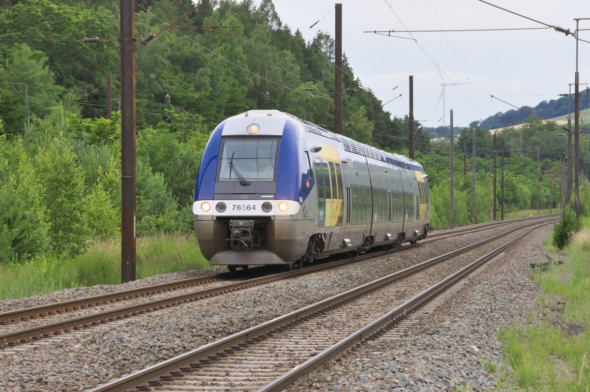 Am 14.06.2018 kehrte für kurze Zeit der Personenverkehr auf die Strecke Thionville - Bouzonville - Hargarten-Falck - Béning zurück. Durch die Streckensperrung zwischen Béning und Rémilly wurden auch einige Personenzüge umgeleitet. Am Abend kam zuerst TER 23500 Metz Ville - Béning angebraust. Vorne lief X 73804 und am Schluß der deutschlandtaugliche X 73912.